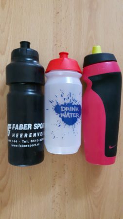 -Bidon zwarte ‘Faber Sport Heerenveen’, bidon met rode dop ‘Drink water’, bidon roze/zwart met zelfafsluitende drinktuit,